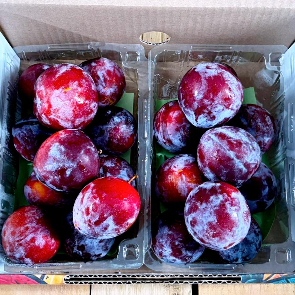 ثمار متوسطة الحجم، بلون أحمر ياقوتي مائل للبنفسجي